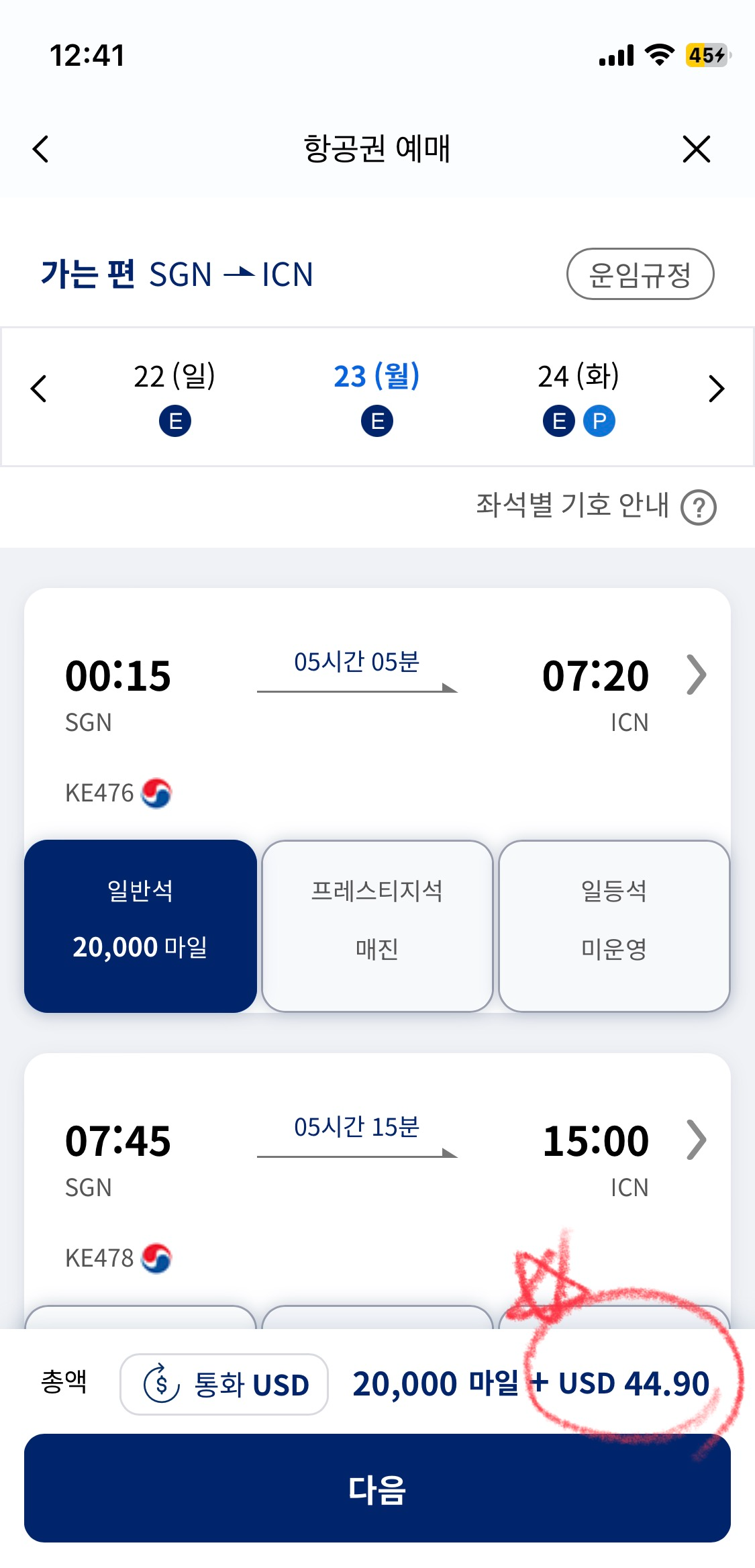 4. 노선은 베트남 동남아로 선택했기 때문에 일반석 20,000 마일리지가 공제되고 유류세 등 세금은 55.9달러 추가 결제 요구되는데요. 비즈니스석 같은 경우 최소한 3개월 이전 예매하시는걸 추천합니다. 원하시는 시간을 선택하고 다음을 눌러주세요.