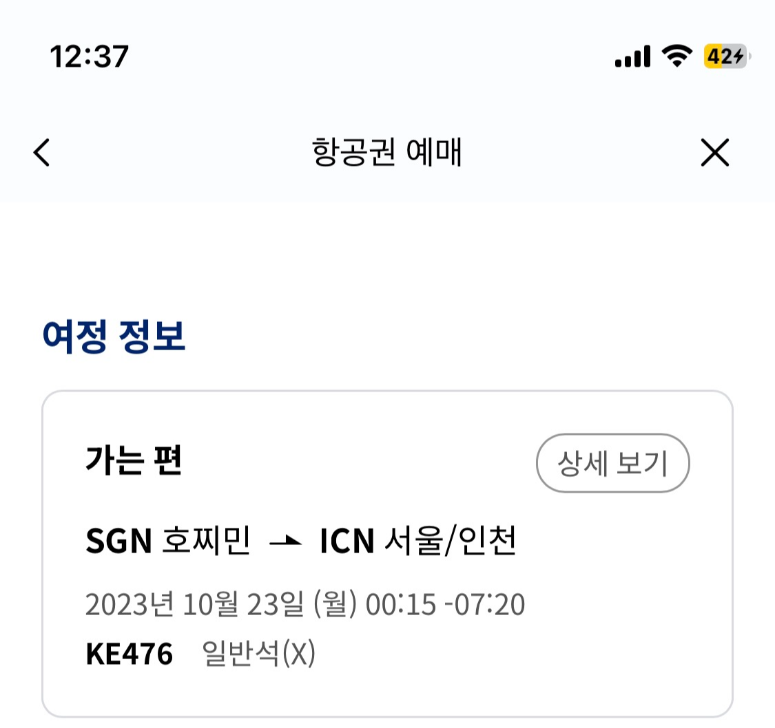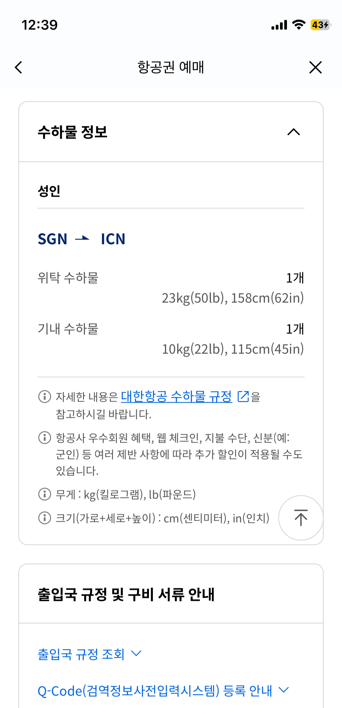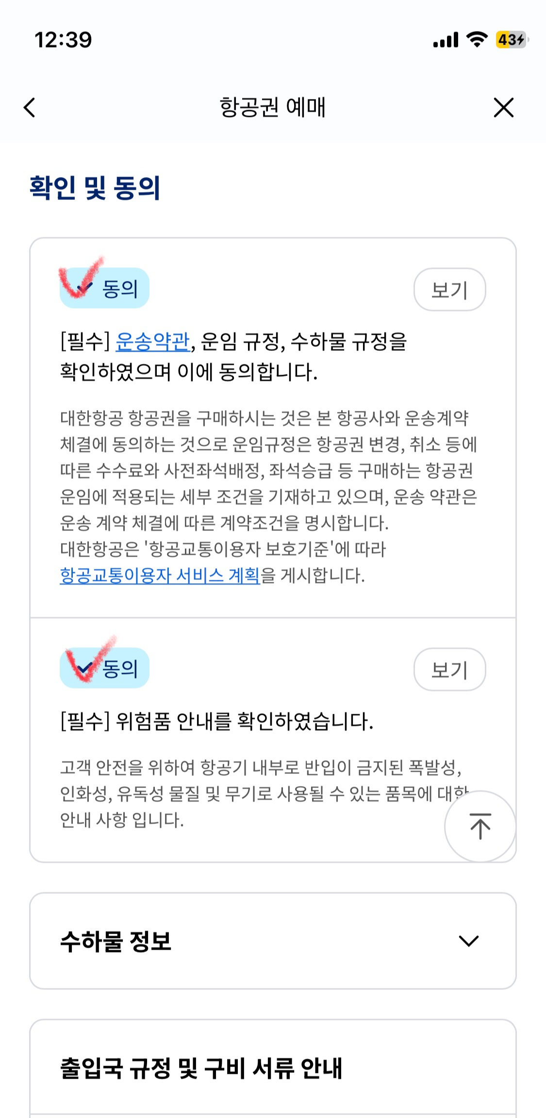 6. 확인 및 동의를 해 줍니다. 수하물 정보를 확인해 보니 위탁수하물 23kg 1개, 기내수하물 10kg 1개 무료입니다.