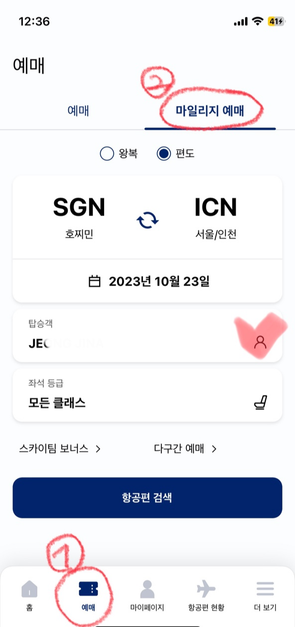 성인(본인) 먼저 마일리지 예매