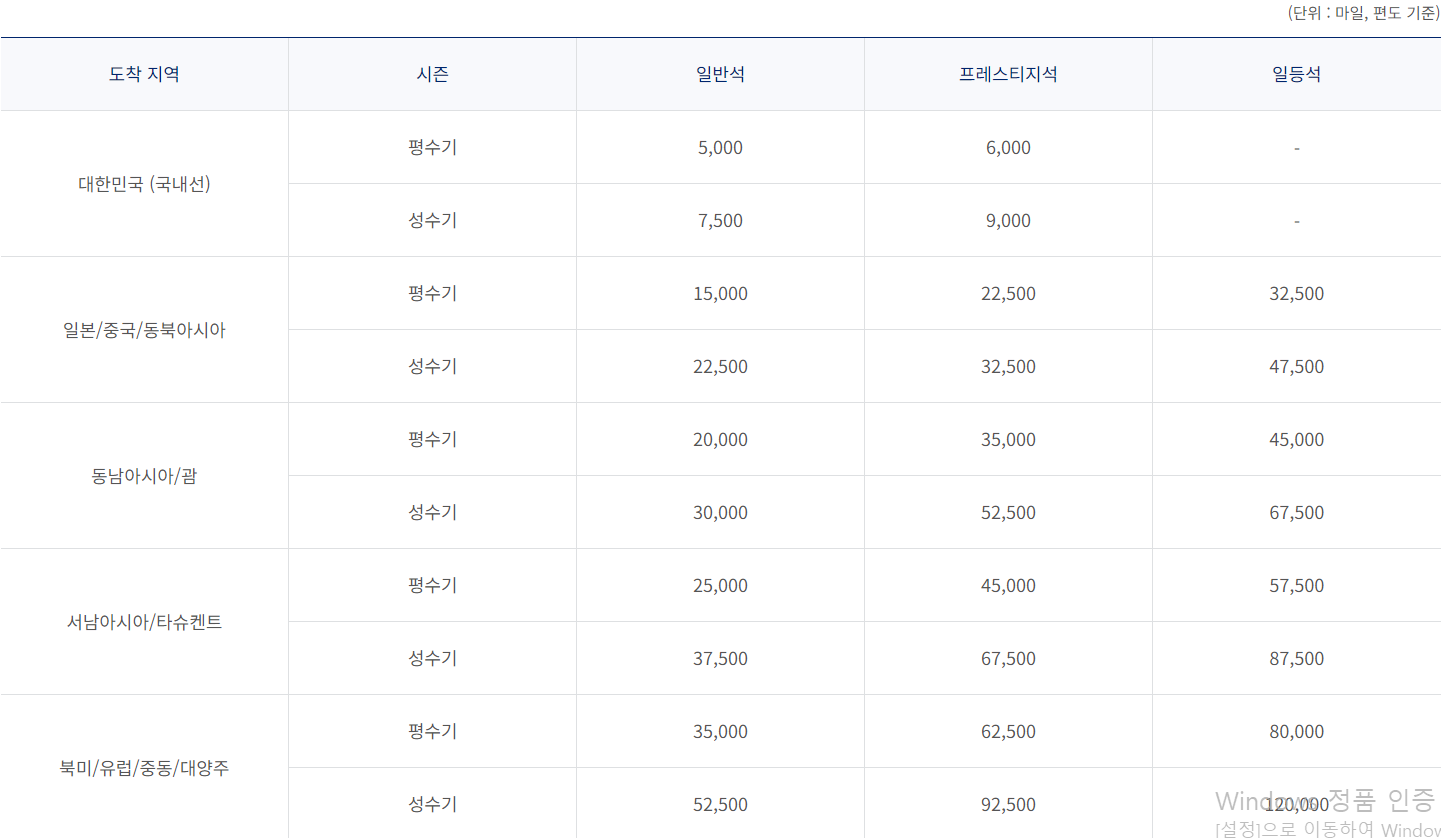 노선별 공제 마일리지는 다음과 같습니다. 일반석 평수기 기준, 동북아 15,000 / 동남아 20,000 / 북미 유럽 35,000 마일리지를 공제하고 이용할 수 있습니다.