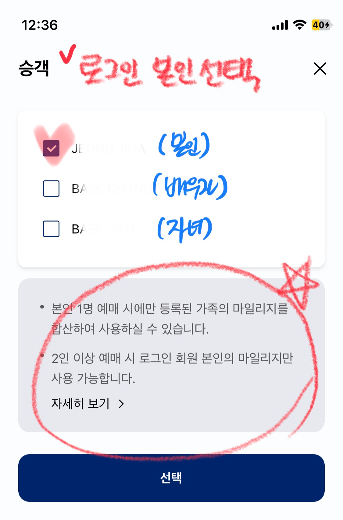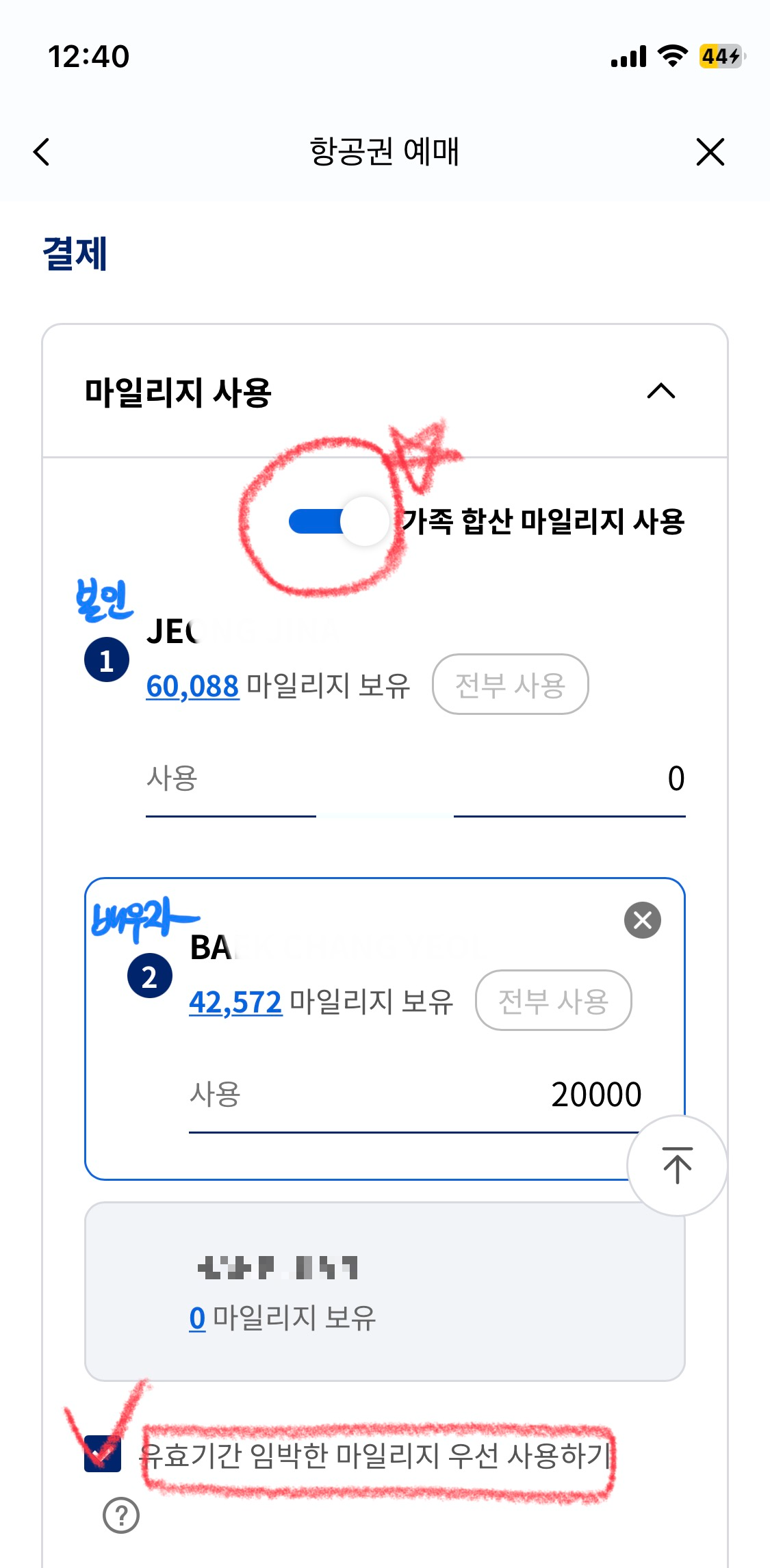 본인 말고 합산된 다른 가족의 마일리지를 사용하는것은 합산 신청한 본인의 티켓만 예매할 때 가능합니다. 그렇기 때문에 합산시킨 가족 마일리지를 사용하기 위해서는 각자 따로 예매를 해 줘야 합니다. 필자 같은 경우 배우자의 마일리지 유효기간이 임박해서 꼭 사용해야 했기 때문에 본인만 선택했습니다.