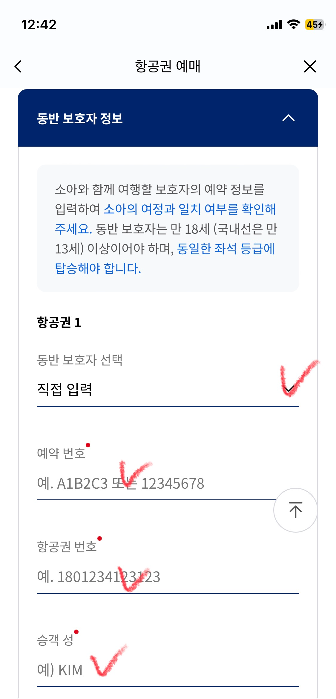 그리고 또 한 가지 다른 점이 있습니다. 소아를 따로 예매해 줄 때는 동반 보호자 정보 입력이 필수인데요. 승객정보 다음이 동반 보호자 정보 입력입니다. 성인(본인) 예매할 때 받은 예약번호와 항공권번호를 입력해 줍니다. 이메일로 받은 이 티켓을 보시면 편합니다. 그리고 추가 금액 44.9달러를 결제해 주면 끝입니다!