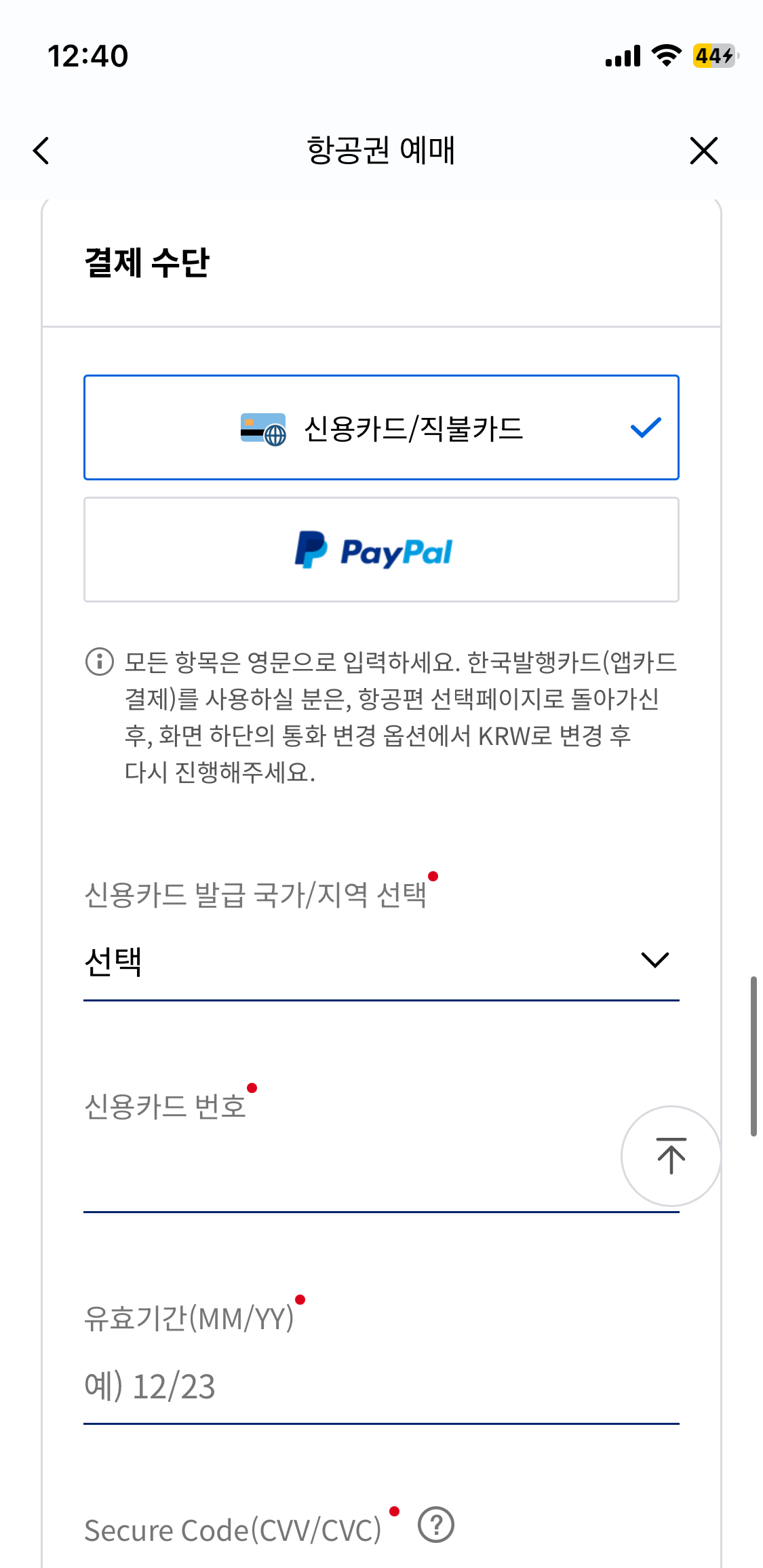 8. 마지막으로 결제입니다. 마일리지 제외한 55.9달러를 결제해야 하는데요. 신용카드 정보를 입력해 주세요. 해외에서 발급받은 신용카드도 모두 가능합니다. 결제하기 해주면 끝~!!! 예매 내역은 앱에서 확인 가능하고 메일로도 이 티켓이 발송됩니다.
