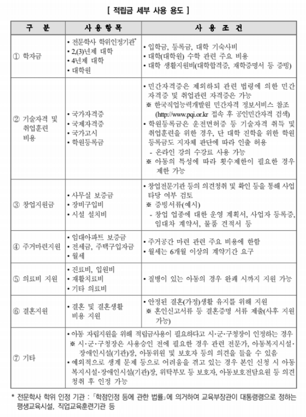 적립금은 만 18세가 만기이며, 이후 학자금, 기술자격 및 취업훈련비용, 창업지원금, 주거마련 등 자립을 위한 용도로 사용 가능합니다.
