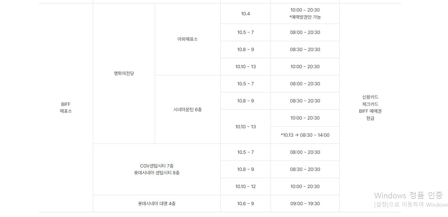 BIFF 매표소의 운영시간은 아래와 같습니다. 해당 매표소에 가셔서 신용/체크카드, BIFF 예매권, 현금을 사용해 현장 구매할 수 있습니다.