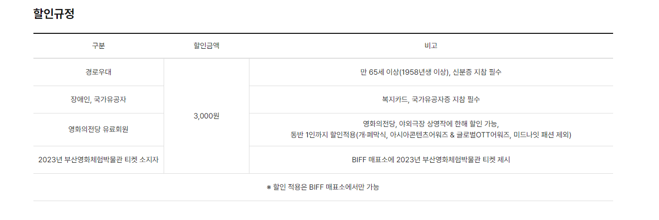 만 65세 이상, 장애인, 국가유공자 등 3000원 할인규정은 BIFF 매표소 현장구매에만 적용되는 점 참고 바랍니다.