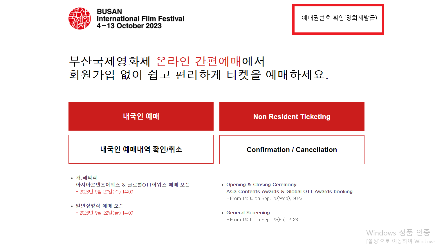 만약 BIFF 예매권(카드,모바일)이 있으신 분은 화면 상단 우측에 예매권번호 유효여부를 확인할 수 있습니다. 해당 없으면 내국인 예매로 접속합니다.