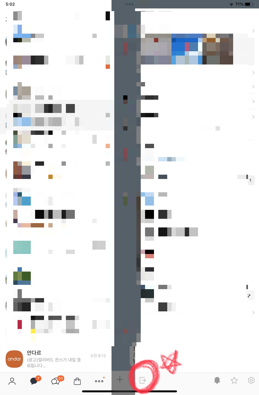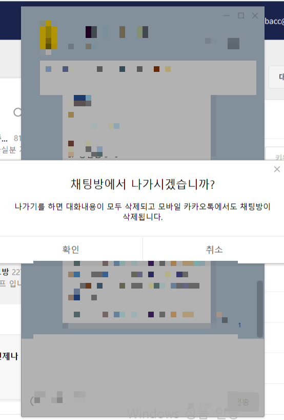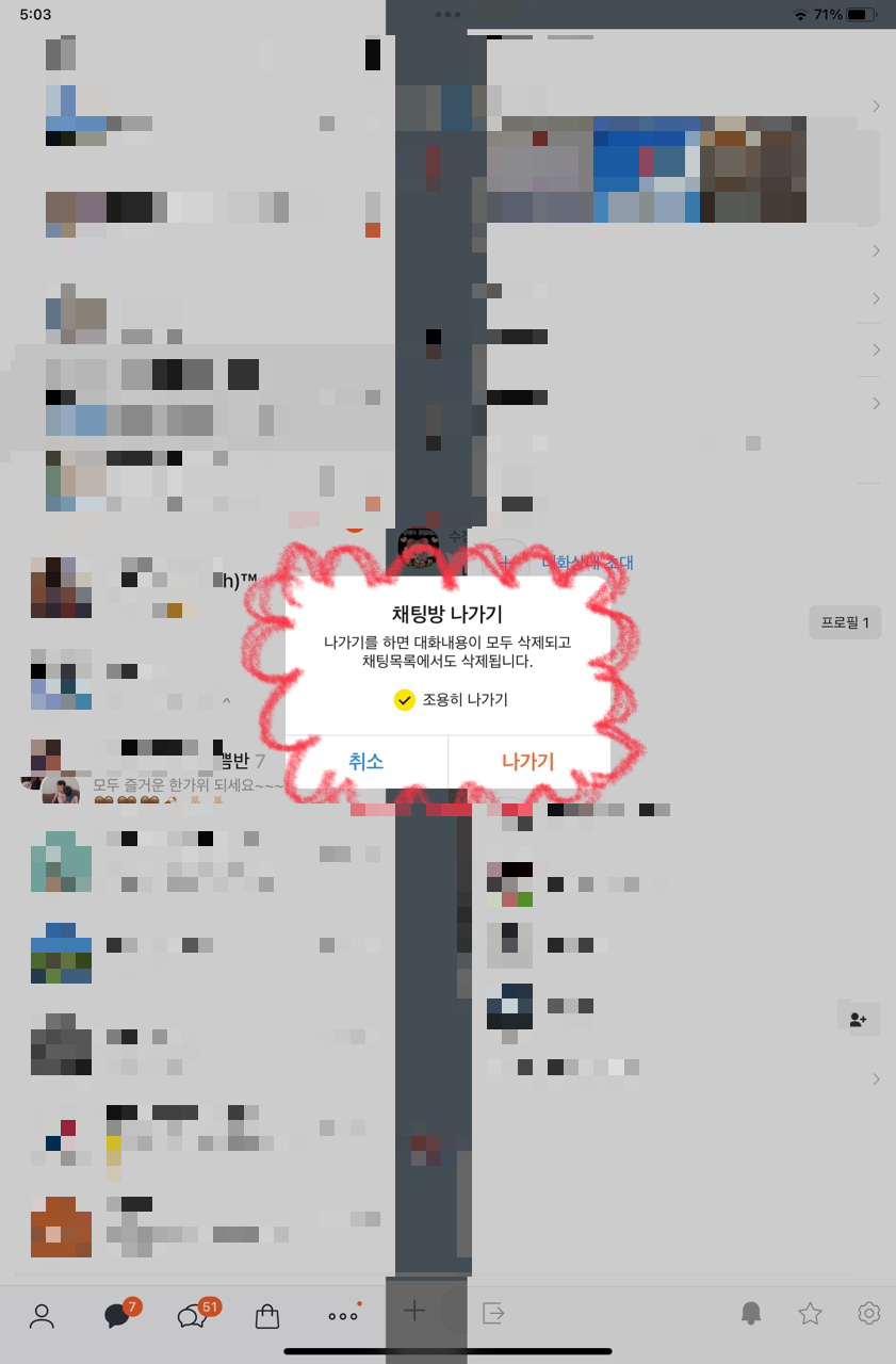 대화상대가 쭉 나오는데 맨 하단 좌측에 나가기 버튼을 눌러주세요. 채팅방 나가기 창 속에 조용히 나가기를 체크해 주고 나가기 해주세요. 오픈채팅방은 핸드폰과 마찬가지로 조용히 나가기 기능이 지원되지 않습니다.