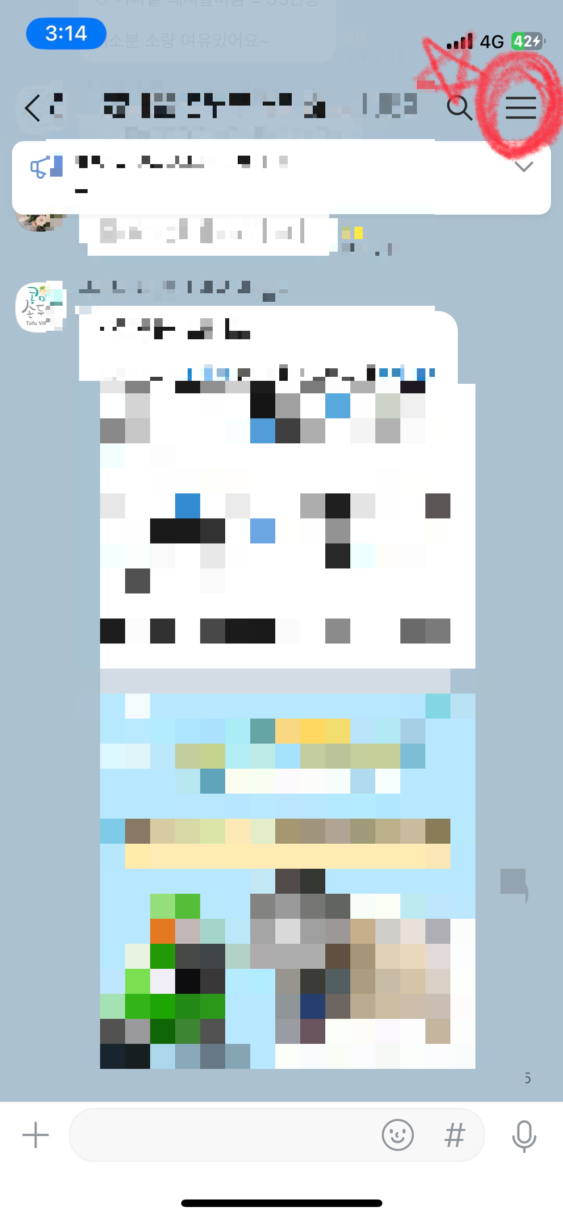 핸드폰과 동일합니다. 나가고자 하는 단톡방에 들어가서 우측 상단의 석 삼자를 눌러줍니다.