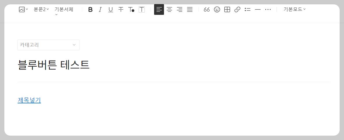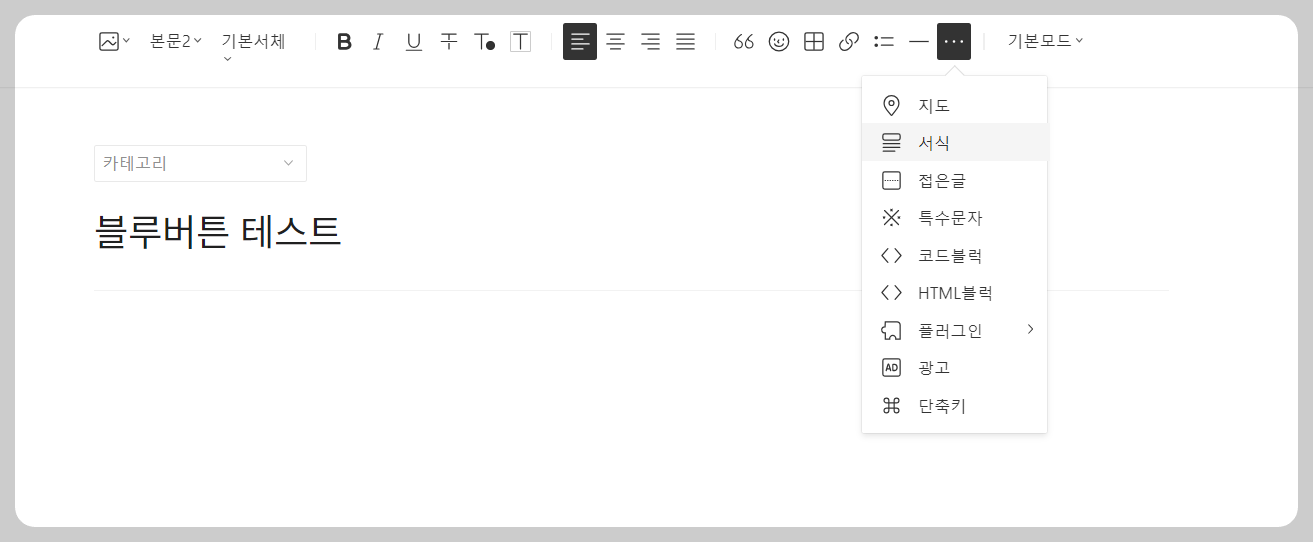 1. 이제 활용단계입니다. 글쓰기에 들어가 제목과 내용을 적어주세요. 저는 테스트 목적으로 발행하느라 제목이 '블루버튼 테스트'입니다. 그리고 상단 점세개을 누르고 서식으로 들어갑니다.
