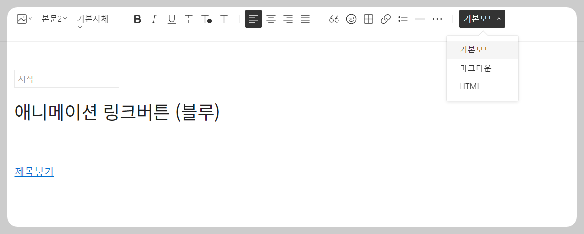 3. '제목 넣기' 부분이 버튼 타이틀을 넣을 곳입니다. 제목 넣기를 지우고 수정해 주세요. 저는 블루버튼으로 바꿔 보겠습니다.
