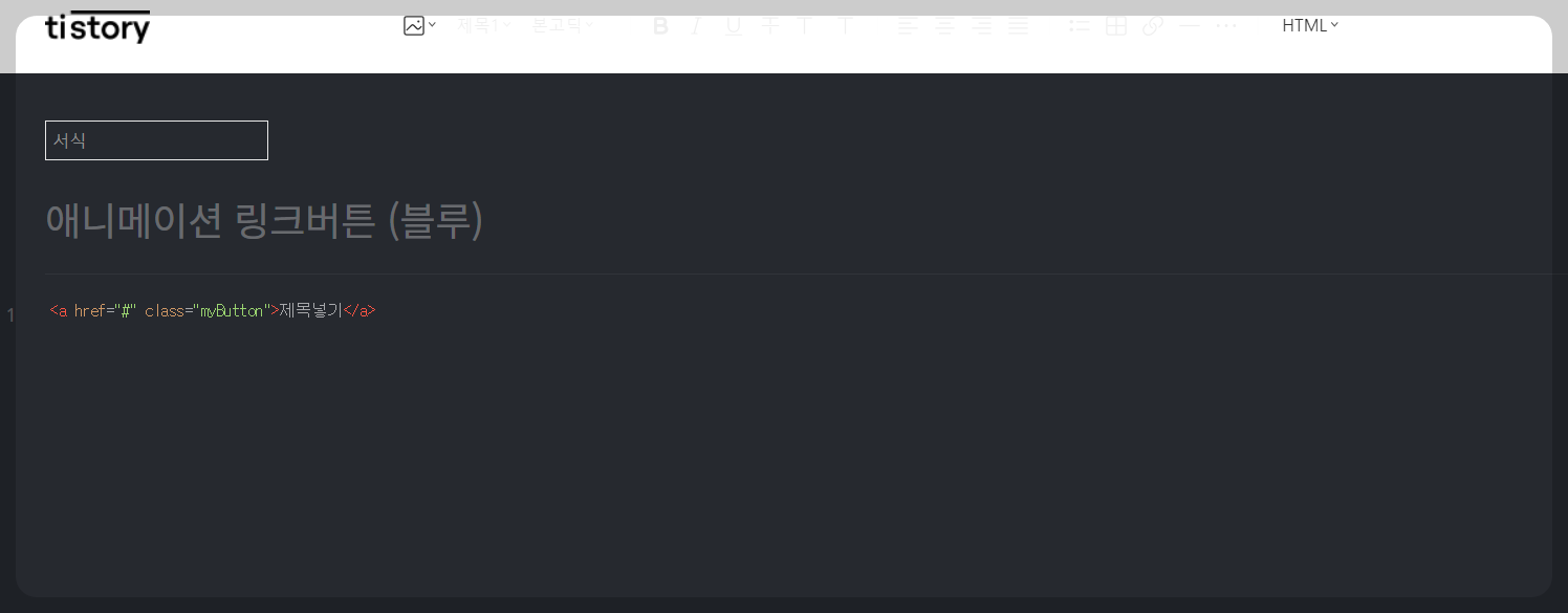 4. 티스토리 블로그 관리 > 콘텐츠 / 서식관리 > 서식 쓰기로 들어갑니다. 제목은 적당히 적어줍니다. 저는 '애니메이션 링크버튼 (블루)'라고 넣었습니다. 그리고 HTML 화면으로 전환해 주고 블루버튼 서식코드를 붙여 넣기 해줍니다.